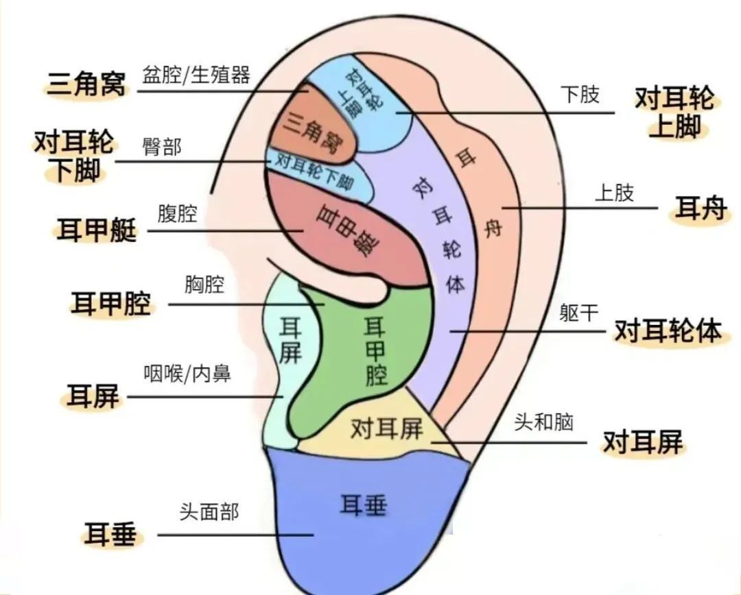 耳朵状就像一个倒置的胎儿,头部朝下,臀部朝上,分布着90多个穴位。